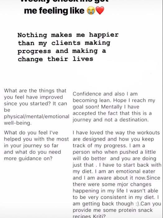 I've been training with Kriti since 6 months. It has been truly helpful. Wrt diet, I've understood so much about macros and dos and don'ts and all of this with you not complicating anything at all. Such follow-able, simple, affordable diets you give. Even workouts, you keep up-ing it slowly and I did not feel like I wouldn't crack this ever.